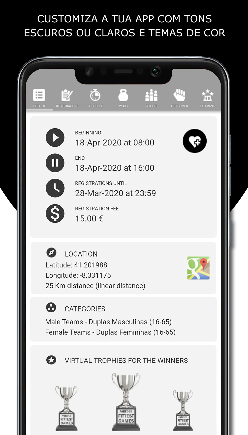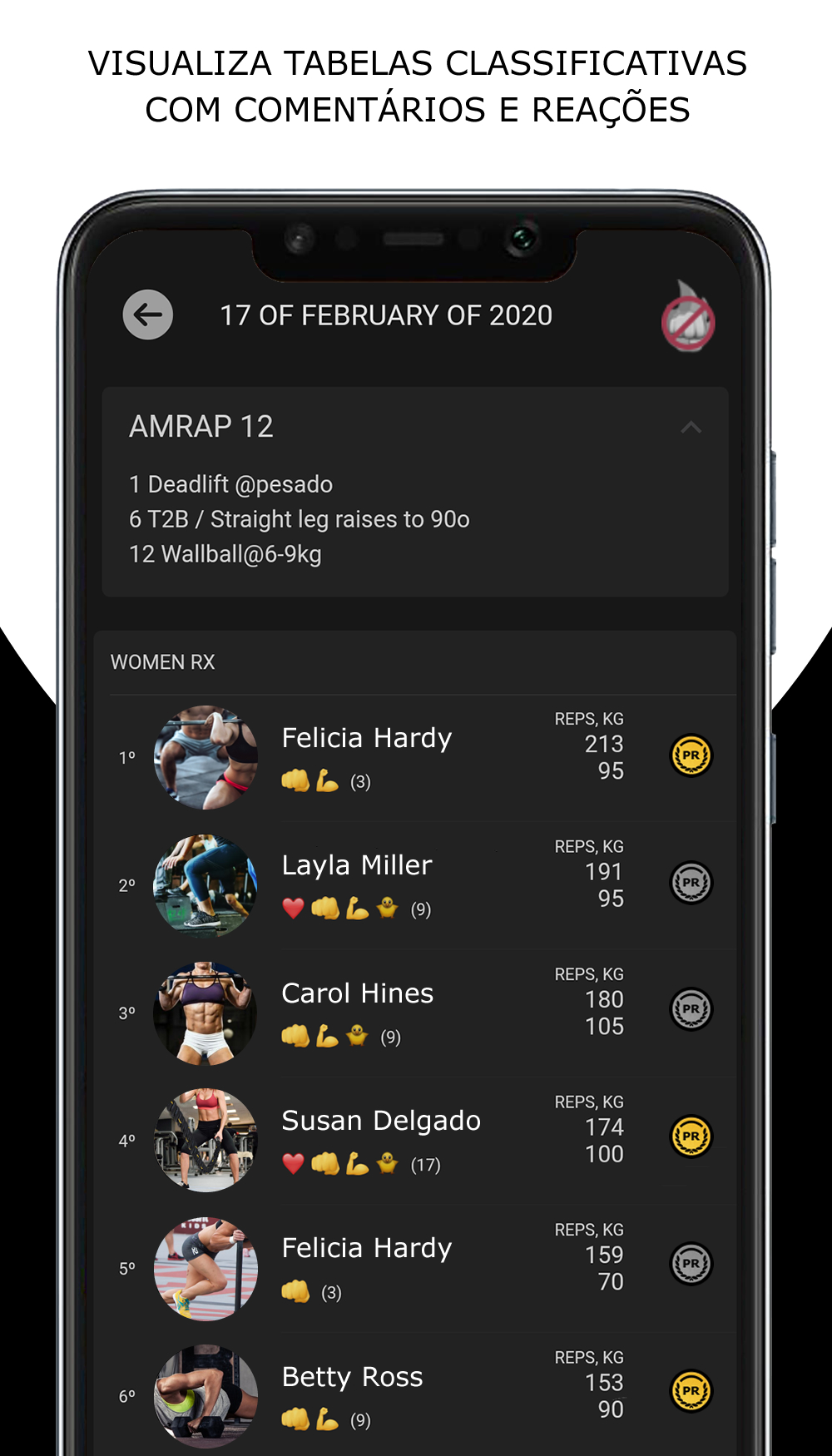 Crie o plano de aula/treino com exercícios e WODS pré-configurados. Associe movimentos e vídeos. Várias formas de registo de resultados (individual, pares, equipas, tempo, reps, rondas+reps, etc).